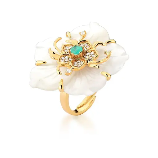 ANEL FLOR EM MADREPÉROLA E CRISTAL BANHADO A OURO