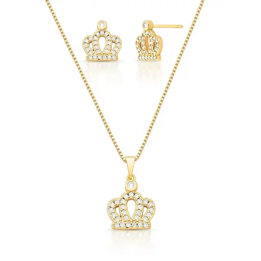 CONJUNTO BRINCO E COLAR DE COROA COM CRISTAL REDONDO E ZIRCÔNIAS