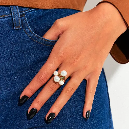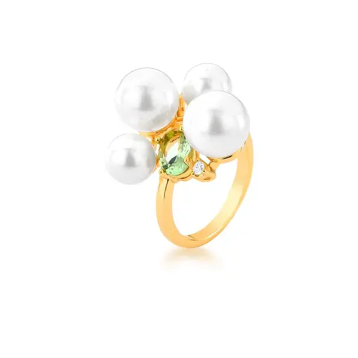 ANEL COM CRISTAIS E PÉROLA SHELL BANHADO A OURO