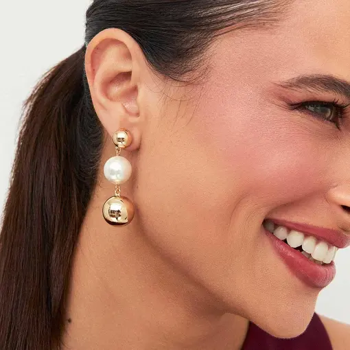 BRINCO EM PÊNDULO COM PÉROLA SHELL E ESFERA BANHADO A OURO