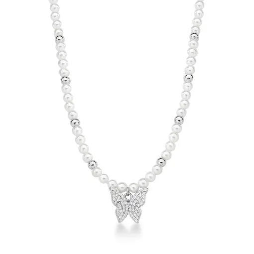 COLAR COM PÉROLAS SHELL E BORBOLETA PRATA RODINADA