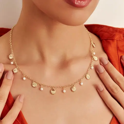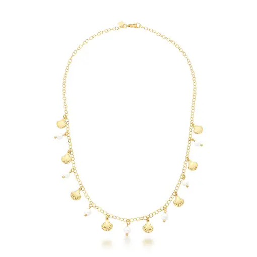 COLAR COM PÊNDULOS DE CONCHA E PÉROLAS BANHADO A OURO